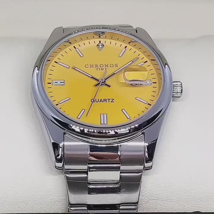 Add a bold touch to your look with the Chronos Classic Orange Dial Watch — a perfect blend of modern design and timeless craftsmanship. Featuring a vibrant orange dial enclosed in a polished stainless-steel case, this watch stands out with its confident and energetic style. The date display window and precise quartz movement ensure both functionality and accuracy.