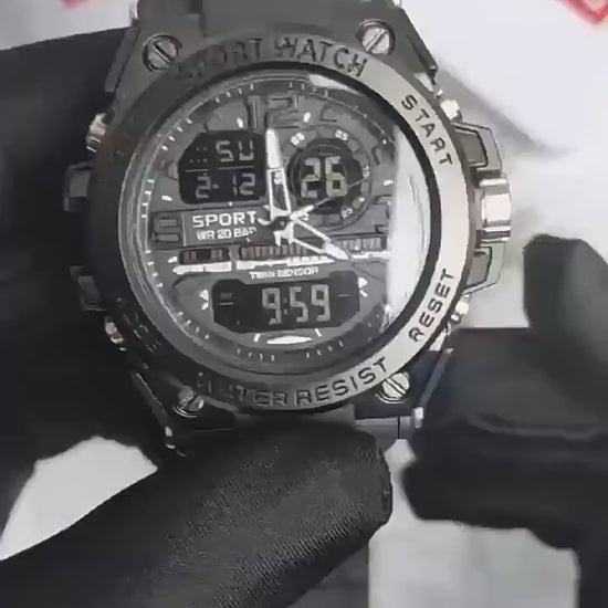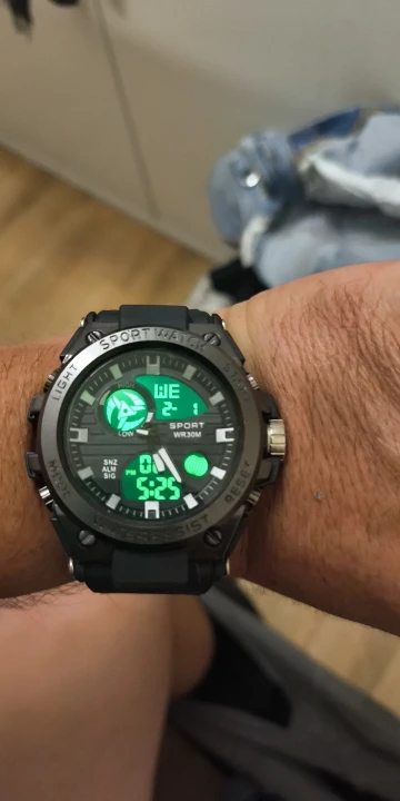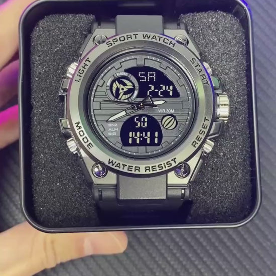 A rugged and stylish sport watch built for action ⌚🔥. Features bright LED cold-light display 🌙, dual time, alarm, stopwatch, and 30M water resistance 💧. Perfect for gym, outdoor adventures, and daily sporty looks 💪🏽🏃♂️.